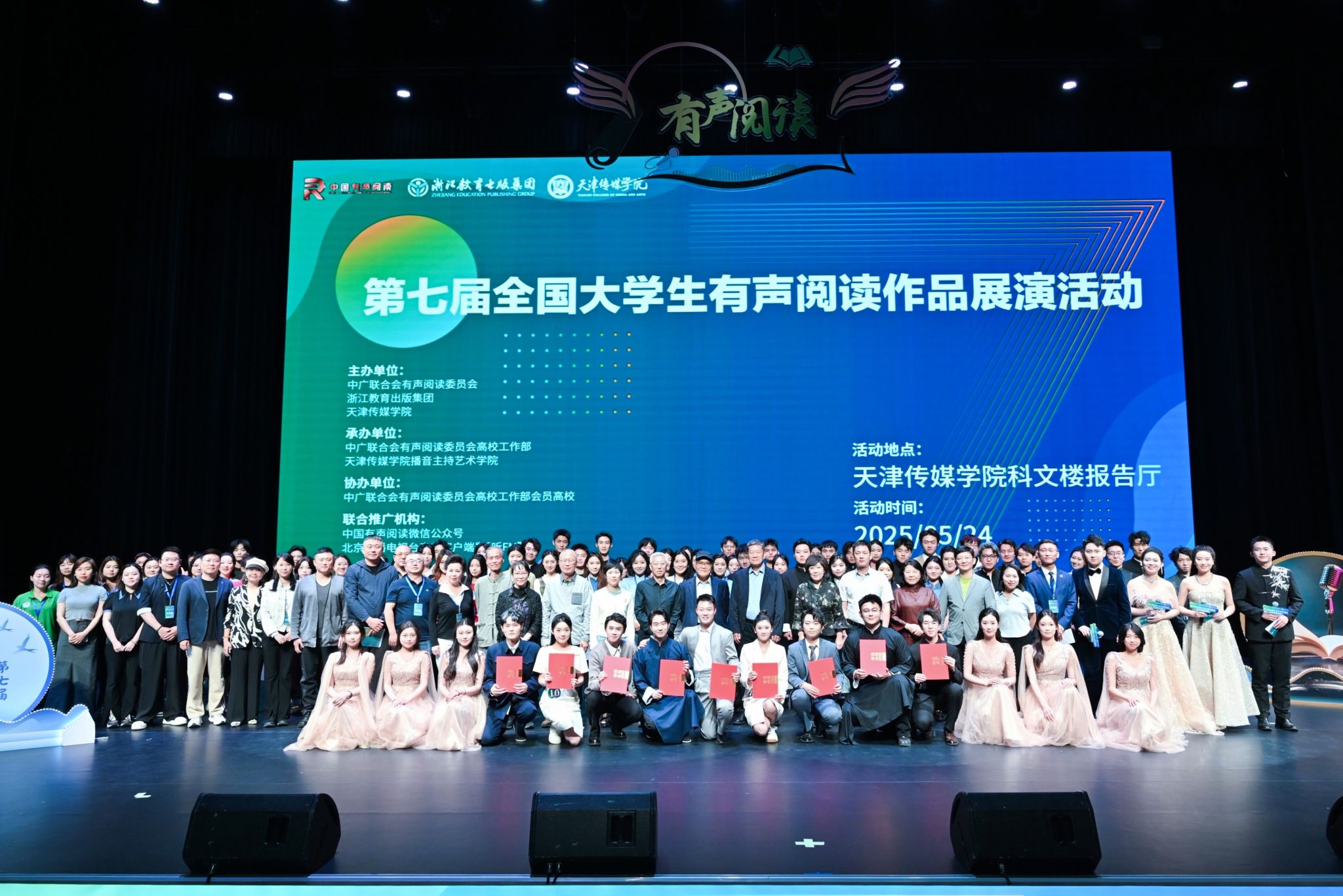 此次展演活动由中国广播电视社会组织联合会有声阅读委员会、浙江教育出版集团、天津传媒学院共同主办,中国广播电视社会组织联合会有声阅读委员会高校工作部、天津传媒学院播音主持艺术学院承办。活动通过集中诵读《之江院士成长之路》一书,展现我国杰出科学家的人生轨迹和学术成就,传承他们的科学精神与爱国情怀,吸引了包括中国传媒大学、暨南大学、上海戏剧学院等知名高校在内的百余所院校的广泛参与,收到了千余件作品。经过初选,共有60支团队齐聚天津传媒学院进行现场展演。